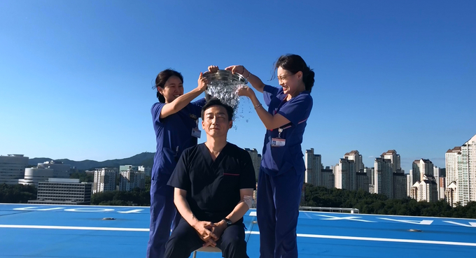 아주대병원 이국종 경기남부권역외상센터장이 지난 8월 17일 아주대병원 본관 옥상 헬리패드에서 루게릭병 환우들을 돕기 위한 ‘아이스버킷 챌린지’에 동참했다.