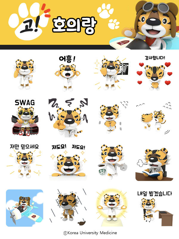 올해 출시되는 새로운 버전의 “GO! 호의랑” 이모티콘은 일과 공부에 고군분투하는 호의랑의 일상을 귀엽고 재치있게 담아 3D로 제작되었다. 해당 이모티콘은 고려대의료원 유튜브 채널(https://youtu.be/WkSCbP_DmMs)에 접속하면 이벤트 참여를 통해 다운로드 받을 수 있으며 선착순으로 지급된다.