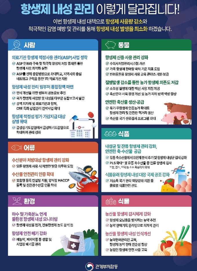 또한 매년 11월 18~24일 ‘세계 항생제 내성 인식 주간’을 계기로 범정부 공동 캠페인을 실시하고, 의료인·수의사·농축수산업 종사자 대상 전문교육과 대국민 홍보를 상시 추진한다.