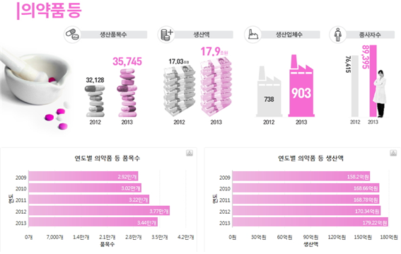 식품의약품안전처(처장 정승)는 2013년 식‧의약품 분야 통계를 수록한 ‘식품의약품통계연보’를 발간․배포하고, 국민들이 식․의약품 생산통계를 쉽게 이해할 수 있도록 시각화한 인포그래픽 통계 서비스를 홈페이지를 통해 제공한다고 밝혔다.