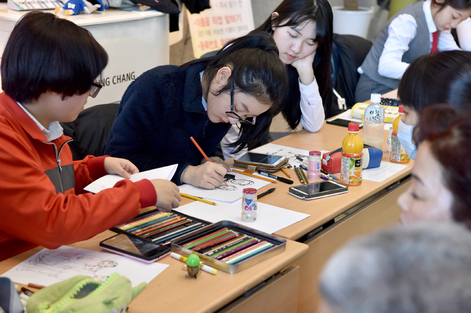 캐리커처를 그려달라는 주문이 몰려, 학생들은 오전9시부터 오후1시까지 거의 쉴틈없이 그리기 작업에 몰두했다.