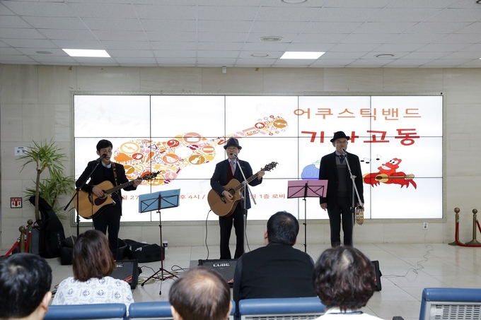 이날 공연은 50대 중반의 고교 동창생 3명으로 구성된 어쿠스틱 밴드 ‘기나고동’의 재능기부로 1시간 동안 진행됐다.
