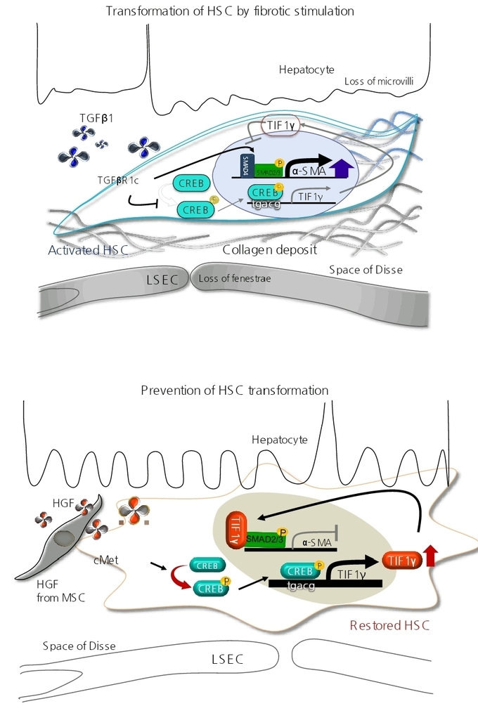 ![간 손상후 간경변증으로 악화되는 과정에서, 새로 발굴한 TIF1 유전자의 역할. [위] 간손상후 섬유화가 악화되는 기전. TGF-SMAD 신호가 발동하면서 간-성상세포에서 TIF1 유전자가 억제되고 섬유화 유전자가 항진돼 간섬유화 초래.[아래] 반면 간-성상세포에서 TIF1 유전자가 유지되면 TIF1 단백질이 섬유화유전자를 억제하여 간 섬유화를 예방.](http://www.medipharmhealth.co.kr/data/photos/20200415/art_15863906569326_69f4ed.jpg)