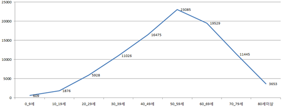 표1. 2019년 연령대별 안면경련(질병코드 G51) 환자 수