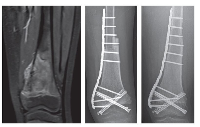 수술 직후(가운데)와 수술 후 4년 이후(오른쪽) 환자의 단순방사선사진. 종양을 제거한 부위는 골이식을 통해 개건했다. 해당 환자의 무릎관절운동은 완벽하게 정상수준까지 회복됐다.
