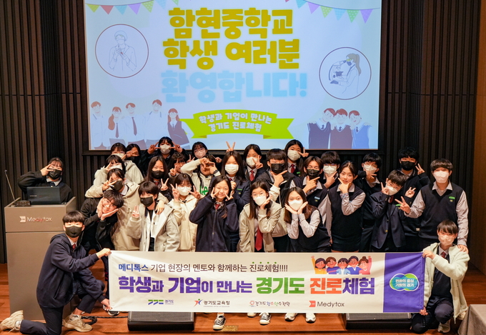 메디톡스(대표 정현호)는 지난 12일 광교 R&D센터에서 경기도, 경기도청소년수련원과 함께 ‘학생과 기업이 만나는 경기도 진로체험’ 첫 행사를 성황리에 마무리했다고 13일 밝혔다. 이번 행사에는 경기도 시흥시 함현중학교 학생 30여명이 참여했다.