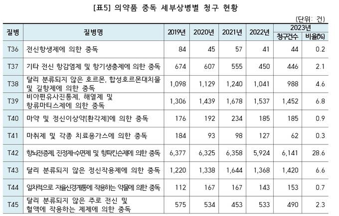 최근 5년간(′19~′23년) 의약품 중독 의약품 중독(주상병 기준): T36~T50 (통계청, 한국표준질병·사인분류(2020))