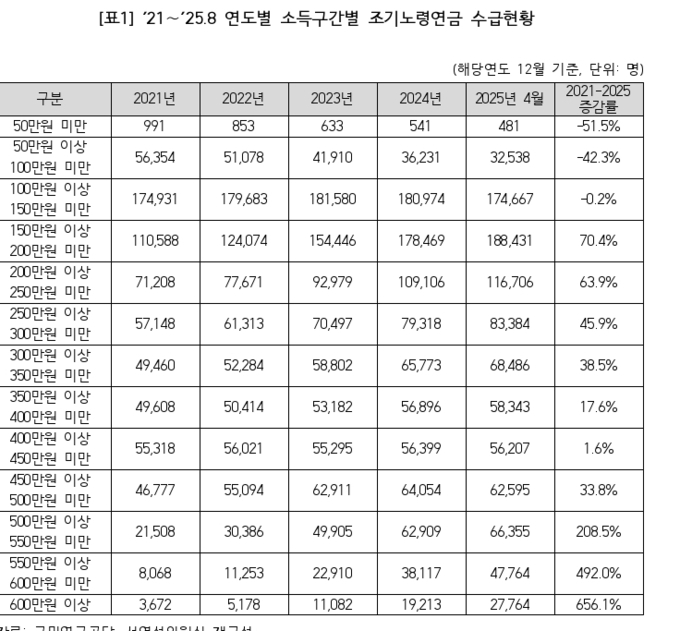 조기노령연금이 고소득층을 위한 수단으로 변질된 사실은 소득구간별 수급자 통계를 통해 확인된다 . 공단 자료에 따르면 소득이 초고소득 구간인 500 만원 이상 550 만원 미만 , 550 만원 이상 600 만원 미만 , 600 만원 이상 구간에서 2021 년 대비 2025 년 조기수급자는 각각 208.5%, 492%, 656.1% 증가한 것으로 나타났다 . 반면 , 본래 제도의 이용 대상인 50 만 원 미만인 저소득 구간에서는 같은 기간 절반이 넘게 감소했고 , 50 만 이상 100 만원 이하에서는 42.3%, 100 만원 이상 150 만원 이하에서는 0.2% 감소했다 .
