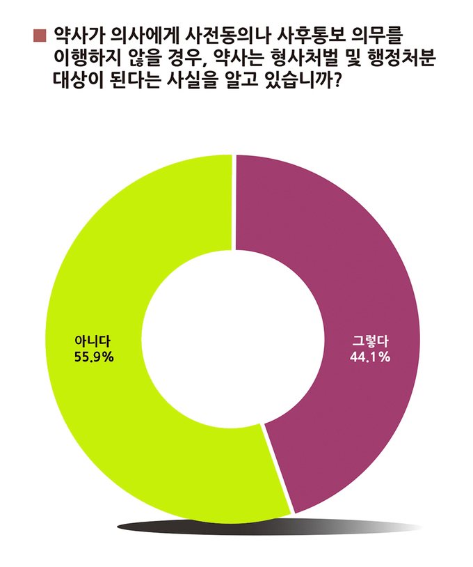 설문조사에 따르면, 응답자의 86%가 현행 대체조제 제도에 대해 부정적인 입장을 보였다. 해당 제도가 성분명 처방으로 이어질 가능성에 대한 우려도 95.7%로 매우 높았다. 특히 약사가 의사에게 사전 동의나 사후 통보 의무를 이행하지 않을 경우 형사처벌 및 행정처분 대상이 된다는 사실을 모르는 응답자가 55.9%로 가장 많았고, 사전 동의나 사후통보가 없는 경우 실제로 보건소 등 관계기관에 통보 등 조치하는 경우는 2.4%에 불과했다. 별도의 조치를 하지 않는 경우는 36.1%였다.