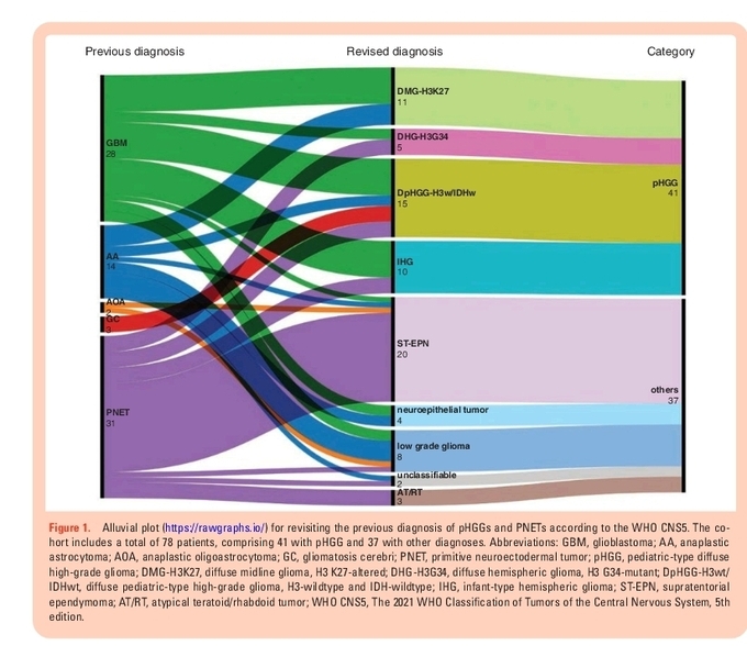 서울대병원 소아신경외과 김승기·김주환 교수와 병리과 박성혜 교수 연구팀은 1997~2023년 서울대어린이병원에서 수술 받고 과거에 교모세포종, 역형성 성상세포종, 역형성 희소성교아성상세포종, 대뇌신경교종증, 원시신경외배엽종양으로 진단된 78명의 조직을 병리학적으로 재검토하고, 면역화학염색과 뇌종양 표적 차세대염기서열분석(NGS)을 시행해 WHO CNS5 기준에 따른 통합 진단을 수행했다.