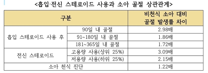 연구 결과 흡입 스테로이드 사용 후 90일 이내 골절 발생률은 비천식군보다 약 3배 높은 것으로 나타났다. 이외 다른 기간에서도 골절 위험이 유의미하게 높았다. 전신 스테로이드 사용군은 저용량 2.15배, 고용량 3.09배 높은 것으로 나타나, 고용량일수록 골절 위험이 증가했다.