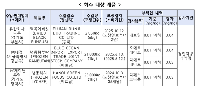 식품의약품안전처(처장 오유경)는 수입식품등 수입판매업체인 ‘유한회사 다온(경기도 부천시 소재)’ 등 3개 업체가 수입해 판매한 수입산 ‘백목이버섯’, ‘냉동람부탄’, ‘냉동리치’에서 잔류농약이 기준치 보다 초과 검출되어 해당 제품을 판매 중단하고 회수 조치한다고 밝혔다.