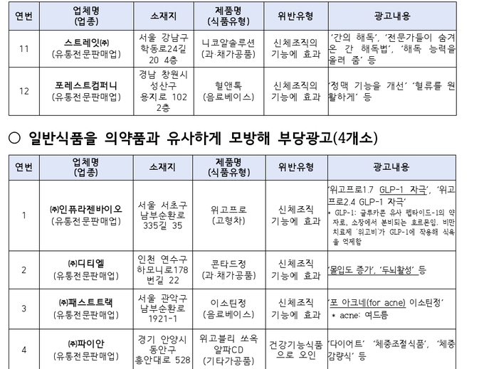 위반 내용은 ▲‘방광염 완치’, ‘전립선 비대증 회복 가능’ 등 질병 예방·치료 효능이 있는 것처럼 표현해 광고한 5개소 ▲일반식품을 ‘위고비와 같은 작용 기전’, ‘염증성 지방부터 먼저 녹여’ 등 의약품 또는 건강기능식품으로 오인·혼동하도록 광고한 3개소 ▲‘세포 자체 회복 능력을 올려줌’, ‘피부가 깨끗해짐’ 등 거짓·과장 광고한 4개소 등이다.
