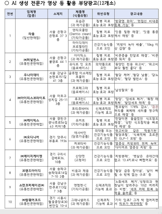 점검 결과 AI로 생성한 전문가 영상 등을 활용해 부당광고한 업체는 12개소로 약 84억 원 상당의 식품을 판매한 것으로 확인됐다.