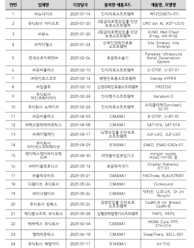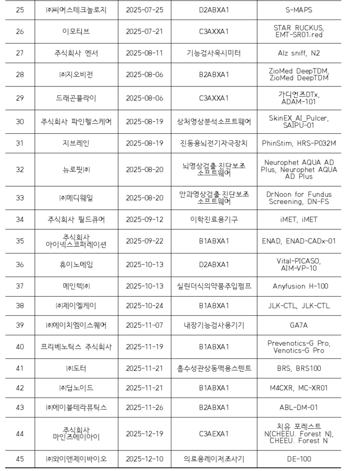 - 2025년도 혁신의료기기 지정 현황(45개 제품)