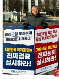 최운창 전라남도의사회장(범대위 대외협력위원회 공동위원장)도 29일 1인 시위를 위해 전남 목포에서 서울을 찾았다. 최 회장은 "불과 2년 전, 정부의 비과학적 의대증원으로 젊은 의사와 의대생은 자신들의 소중한 시간을 바쳐야 했고 국민은 큰 혼란에 빠졌다"라며 "국민주권을 지향하는 새로운 정부에서도 숙의되지 않는 추계위의 섣부른 결론을 빌미로 2년 전 아픔을 되풀이하려고 한다"고 토로했다.