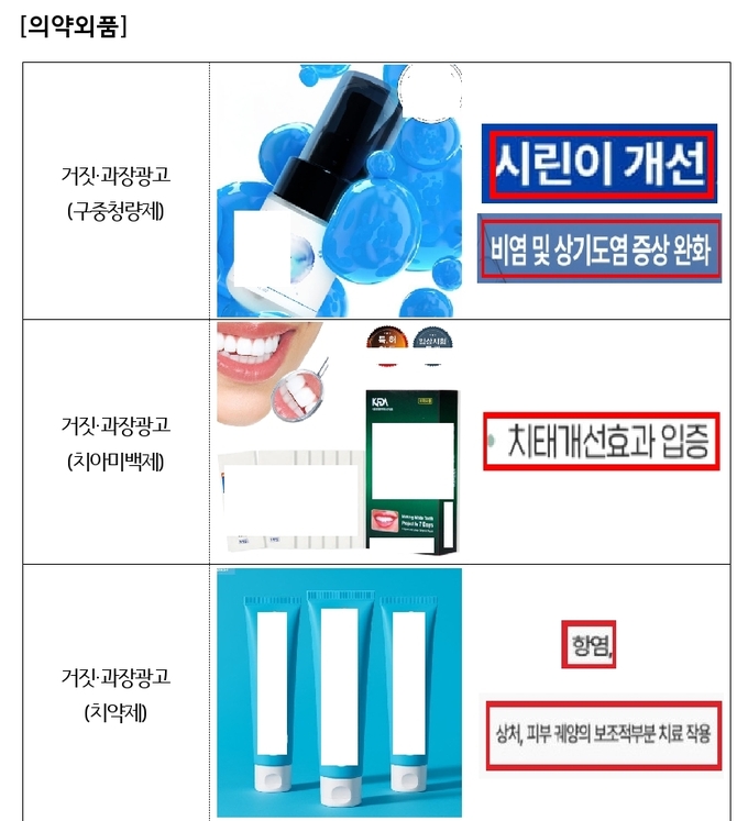 구중청량제를 ‘시린이 개선’·‘치주질환 치료’ 등으로 광고하거나, 치아미백제를 ‘치태 개선’으로, 치약제를 ‘잇몸 재생’·‘잇몸질환 개선’ 등으로 홍보한 사례가 대표적이다.