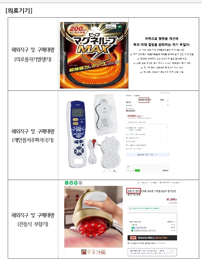 의료기기 점검에서는 국내 허가를 받지 않은 의료기기를 해외 구매대행(직구) 방식으로 유통·광고한 불법 사례 100건이 적발됐다.