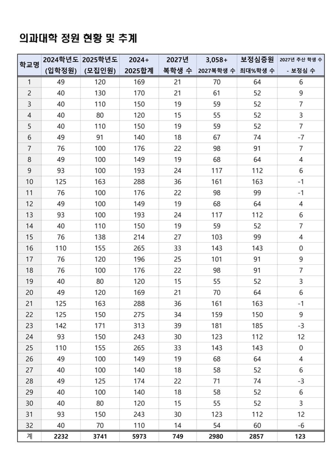 의대교수협은 이 휴학생들이 2026년과 2027년에 각각 50%씩 복귀한다는 보수적 가정을 적용해 2027학년도 재학생 수를 추산했다. 그 결과, 추가 증원이 전혀 없더라도 이미 보건의료정책심의위원회(보정심)가 제시한 대학별 최대 증원 기준을 전국적으로 123명 초과하는 것으로 나타났다고 밝혔다.