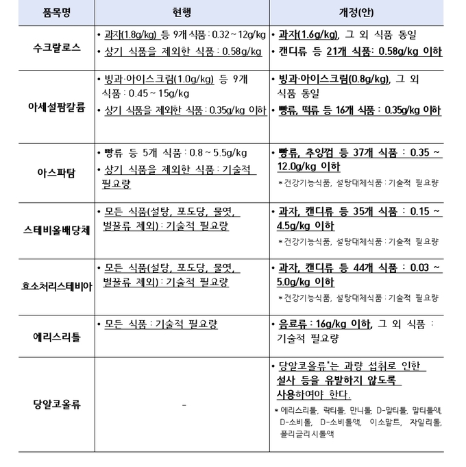 구체적으로 수크랄로스는 과자류의 사용기준을 1.8g/kg 이하에서 1.6g/kg 이하로 강화하고, 캔디류 등 21개 식품유형에 대해 0.58g/kg으로 설정한다. 아세설팜칼륨은 빙과·아이스크림의 사용량을 1.0g/kg 이하에서 0.8g/kg 이하로 강화하고, 빵류·떡류 등 16개 식품유형에 대해 0.35g/kg 이하로 정한다.