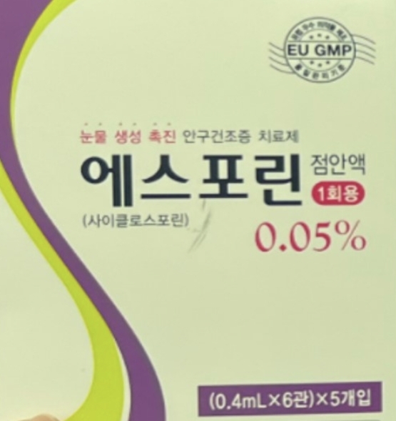 식품의약품안전처는 삼천당제약(주)이 제조·판매한 ‘에스포린점안액 0.05%(사이클로스포린.사진)(1회용)’ 일부 제품에서 외부 포장과 실제 내용물이 서로 다른 것으로 확인돼 해당 제조번호에 대해 영업자 회수를 실시한다고 밝혔다.