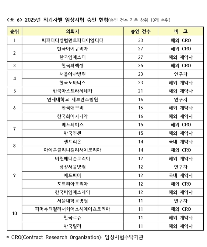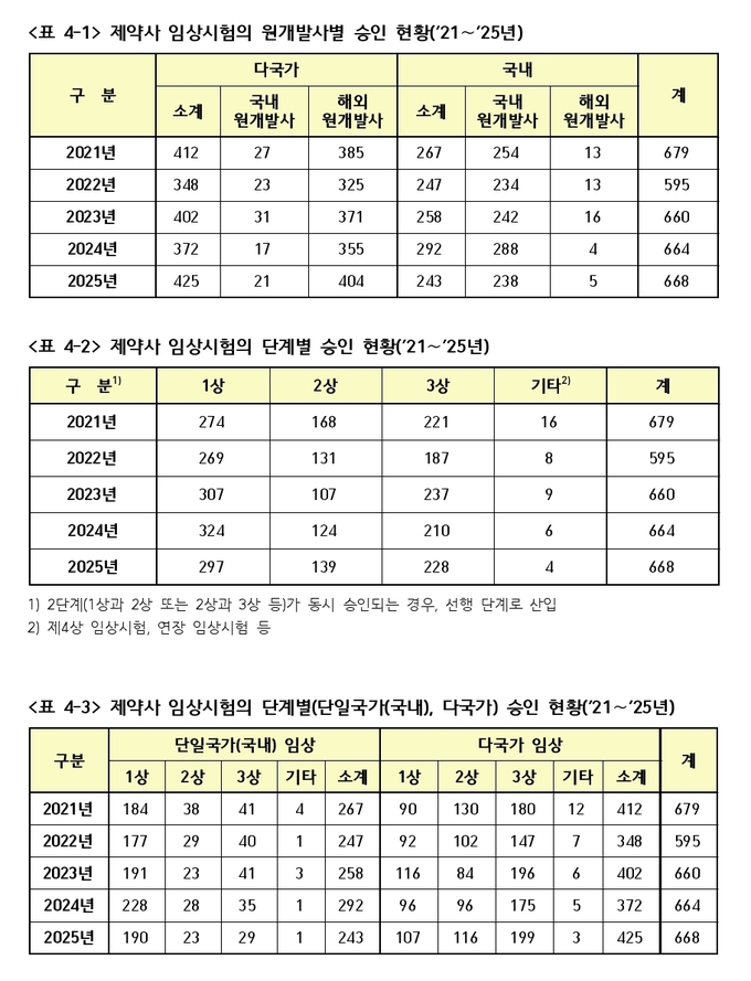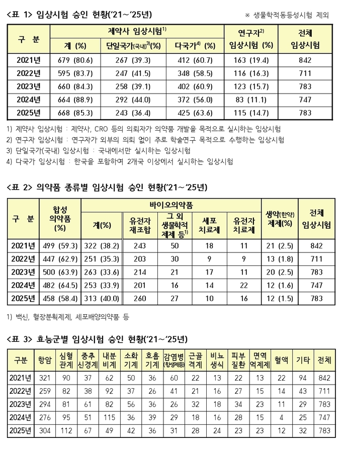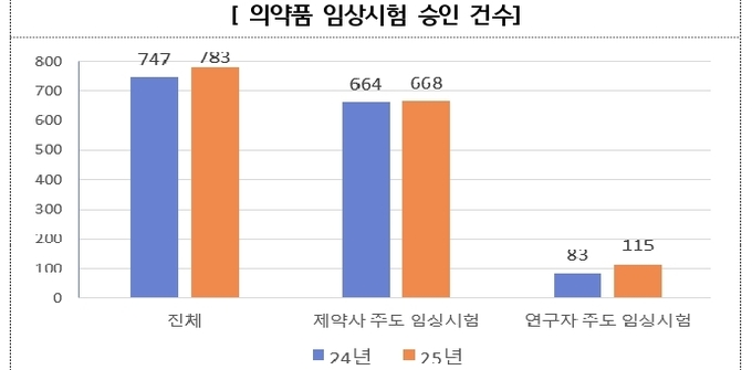 식약처에 따르면 2024년 747건이던 임상시험 승인 건수는 2025년 783건으로 늘었다. 이 가운데 제약사 주도 임상시험은 668건(85.3%), 연구자 주도 임상시험은 115건(14.7%)이었다.