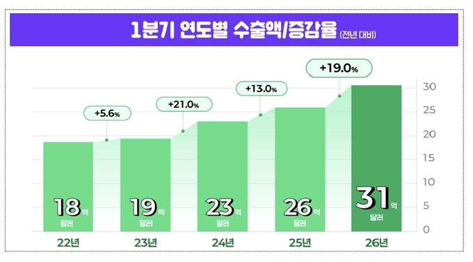 특히 올해 1분기는 1~2월까지는 큰 변동이 없었으나, 3월 수출이 전년 대비 29.3% 급증한 11억9000만 달러를 기록하며 분기 최대 실적을 견인했다.