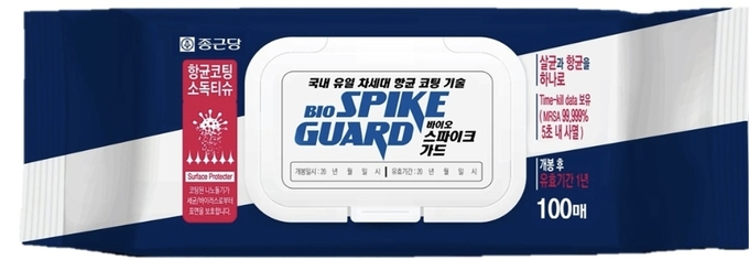 ‘바이오 스파이크 가드’는 즉각적인 살균력을 가진 디데실디메틸암모늄염화물(DDAC)과 표면에 물리적 보호막을 형성하는 유기실란(Si-QAC)을 결합한 차세대 환경소독티슈다. 잠자리 화석 날개 표면에서 착안한 스파이크 구조를 적용해, 초기 살균 이후에도 표면에 보호막을 형성함으로써 물리적으로 미생물 사멸을 유도하는 것이 특징이다.