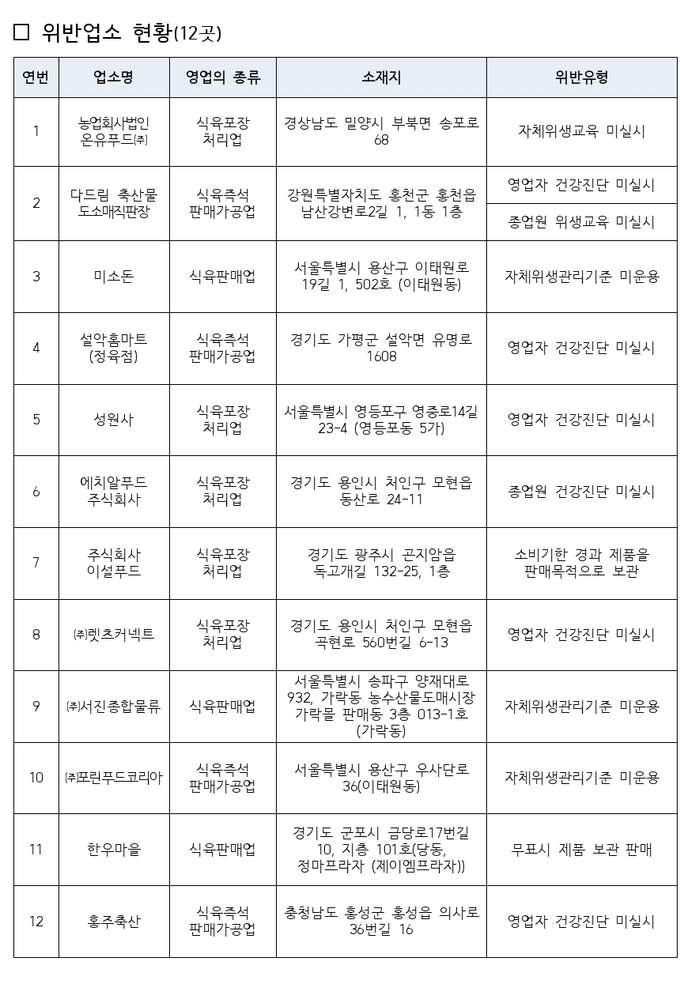 주요 위반 내용은 ▲건강진단 미실시(6곳) ▲자체 위생관리기준 미운영(3곳) ▲소비기한 경과 제품 보관·판매(1곳) ▲무표시 제품 보관·판매(1곳) 등이다.