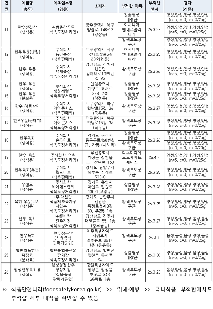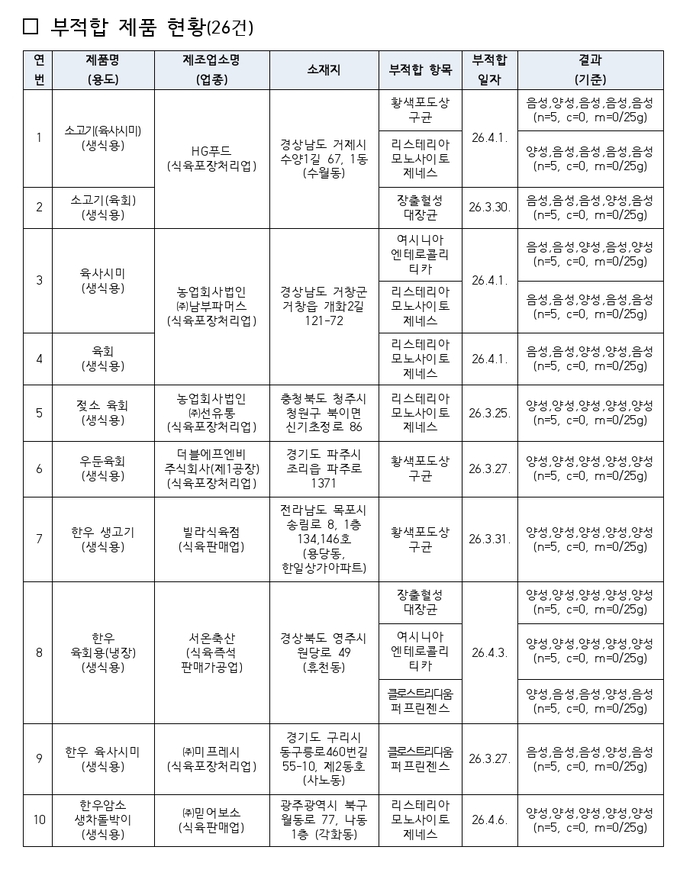 현장 점검과 함께 유통 중인 육회 제품을 포함한 포장육·식육 940건을 수거해 동물용의약품 및 식중독균 등을 검사한 결과, 생식용 식육 등 26건에서 식중독균이 검출돼 전량 폐기 조치됐다. 세부적으로는 생식용 식육 215건 중 24건(11.2%), 분쇄육 61건 중 2건(3.3%)이 부적합 판정을 받았다.