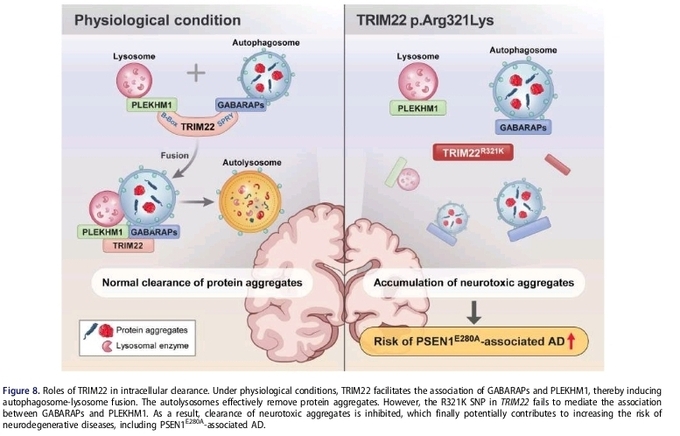 또한 TRIM22-R321K 돌연변이에 의해 TRIM22의 기능이 억제되고, 그 결과 오토파지의 활성 감소 및 신경독성 물질의 축적이 발생될 수 있음을 증명함으로써 알츠하이머병의 신규 분자 발병 기전을 제시했다.