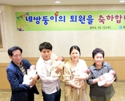 충북대학교병원에서 지난 8월 17일 네 쌍둥이가 태어나 화제가 된 가운데, 12일 퇴원 축하회가 열려 눈길을 끌었다. 이번 행사는 지난 8월 태어난 네 쌍둥이 모두가 12일을 기해 모두 건강하게 퇴원하게 돼 축하의 자리가 마련된 것. 지난 9월 21일 첫째아(남, 1.56kg→3.2Kg)와 둘째아(남, 1.62kg→3.1Kg)가 퇴원해 건강하게 잘 자라고 있다. 또 셋째아(여, 1.56kg)도 현재 몸무게 3.1kg으로 지난 9월 26일 퇴원했고, 넷째아(여, 1.1kg)도 10월 12일 2.5kg으로 퇴원하게 됐다. 네 쌍둥이 퇴원축하회는 12일(수) 오후 1시 20분 충북대학교병원 권역호흡기센터 10층 회의실에서 열렸다. 이날 축하회에는 조명찬 병원장을 비롯해 네 쌍둥이 가족과 친·외조부모, 이승훈 청주시장, 변상면 우암새마을금고 이사장 등이 참석했다. 이승훈 청주시장은 충북대학교병원을 방문해 조 씨 부부를 격려하면서 “네 쌍둥이의 탄생은 우리나라의 큰 경사이고 100만 인구 늘리기를 추진하는 청주시의 경사”라며 “아이들이 건강하게 자랄 수 있는 환경을 만드는데 최선을 다하겠다”고 말했다. 조명찬 원장은 네 쌍둥이 부모에게 꽃다발을 건네며 “미숙아로 태어