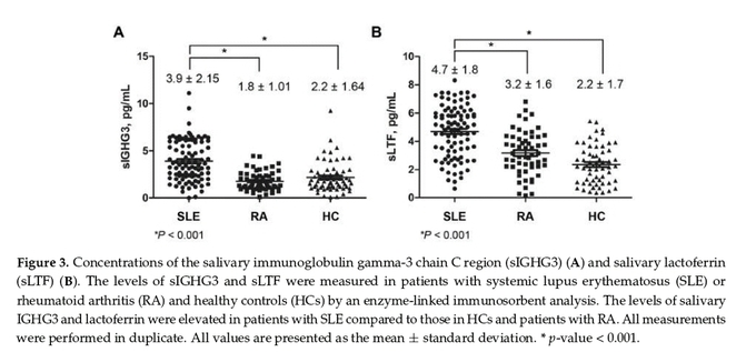 또 전신홍반루푸스 환자군(97명), 류마티스관절염(57명), 건강대조군(62명)을 대상으로 웨스턴블롯 분석 및 효소 결합 면역 흡착 분석을 통해 이들 후보 단백성분의 타액 내 정확한 농도를 측정했다. 그 결과 타액 내 ’면역글로블린 감마 3의 C부위‘와 ’락토페린‘ 수치가 류마티스관절염 환자군과 건강대조군에 비해 통계적으로 유의하게 전신홍반루푸스 환자들에서만 증가했음을 확인했다.