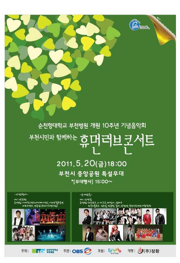 개원 10주년을 맞아 순천향대학교 부천병원(병원장 홍대식)이 OBS 와 함께 하는 특집 공개 방송으로 부천시민을 위한 ‘휴먼러브 콘서트’를 오는 5월20일(금) 오후 6시부터 부천시 중앙공원 잔디광장에서 개최한다.