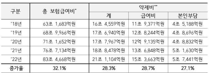 연도별로 살펴보면, ▲2018년 총 약제비는 16조 4,559억원(급여비 11조 9,371억원, 본인부담금 4조 5,188억원)이었고, ▲2019년에는 총 17조 6,940억원(급여비 12조 8,244억원, 본인부담금 4조 8,696억원), ▲2020년 17조 7,967억원(급여비 12조 9,135억원, 본인부담금 4조 8,832억원), ▲2021년 18조 8,478억원(급여비 13조 6,848억원, 본인부담금 5조 1,630억원)으로 꾸준한 상승세를 보였다. ▲2022년에는 총 약제비가 21조 1,104억원으로 급증했으며, 이 중 건강보험 급여비는 15조 3,663억원, 본인부담금은 5조 7,441억원을 차지했다.