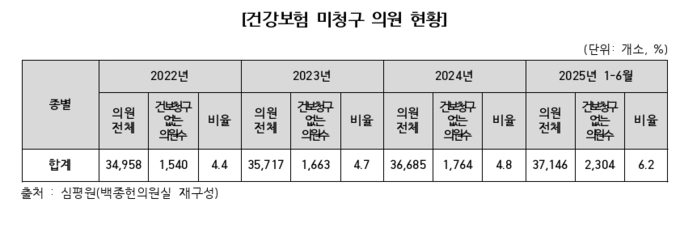 국회 보건복지위원회 백종헌 의원(국민의힘, 부산 금정구)이 건강보험심사평가원(심평원)으로부터 제출받은 자료에 따르면, 2025년 상반기 기준 건강보험 진료비 청구가 단 한 건도 없는 의원급 의료기관이 2,304곳에 달하는 것으로 확인됐다. 이는 2022년 1,540곳에서 3년 사이 약 50% 증가한 수치다.