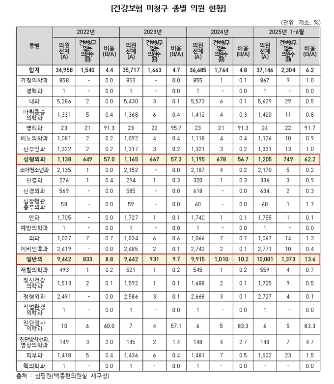 건강보험 미청구 종별 의원 현황을 보면, 성형외과와 일부 일반의에서 미청구 사례가 집중되어 있었으며, 서울 강남구의 경우, 성형외과의 79%(452곳 중 358곳), 일반의의 42%(741곳 중 311곳)가 건보 청구 실적이 전무한 것으로 나타났다.