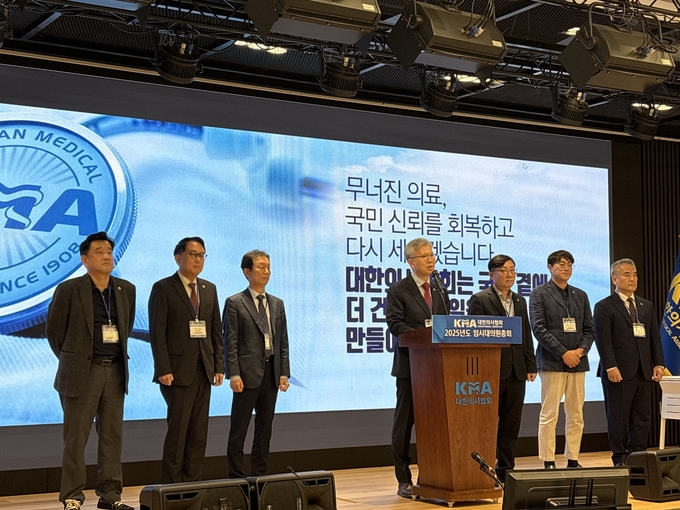 대한의사협회는 25일 오후 4시30분 회관 지하 1층 대강당에서 2025년도 긴급 임시대의원총회 '성분명 처방 강제화 법안 및 한의사 x-ray사용 의료법 개정안 저지와 검체수탁고시 정상화'를 위한 비상대책위원회 설치의 건을 부결 ㅅ키고 집행부를 중심으로 투쟁의 강도를. 높이기로. 했다.