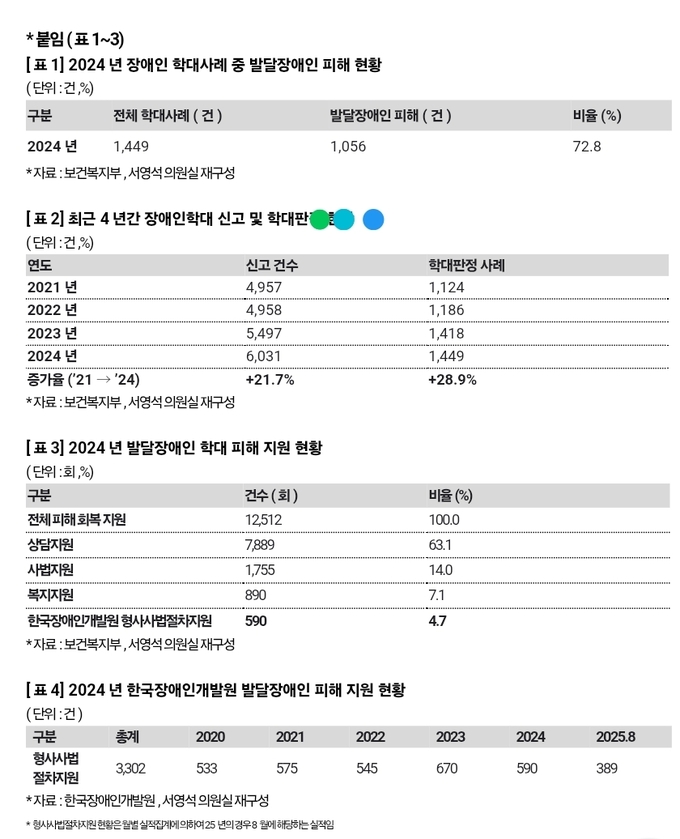 2024 년 장애인 학대사례 1,449 건 중 발달장애인 피해는 1,056 건으로 전체의 72.8% 를 차지했다 . 학대 피해를 입은 발달장애인을 대상으로는 총 12,512 회의 피해 회복 지원이 실시됐으며 이 중 상담 지원이 7,889 회 (63.1%), 사법 지원 1,755 회 (14%), 복지지원 890 회 (7.1%) 로 집계됐다 . 그러나 한국장애인개발원이 제출한 자료에 따르면 장애인개발원이 직접 수행한 형사 · 사법절차 지원은 590 회로 전체 피해지원의 약 4.7% 에 불과한 것으로 나타났다 .