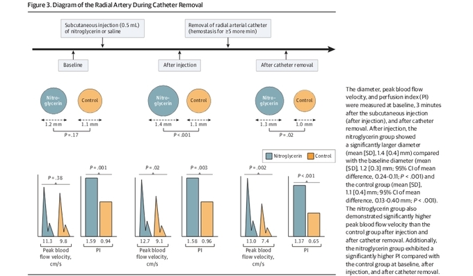 한편, 동맥관 제거 후 요골동맥 폐색이 발생하더라도 니트로글리세린을 사용했을 때 빠른 혈류 회복이 가능한 것으로 나타났다. 처치군은 폐색이 발생한 환자 17명 중 14명(82.4%)이 퇴원 전 혈류를 회복한 반면, 대조군은 48명 중 20명(41.7%)이 회복하는데 그쳤다.