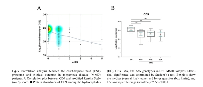 추가적으로 연구팀은 가중 유전자 공발현 네트워크 분석을 통해 변화 패턴이 유사한 단백질들을 그룹화하고, 모야모야병 임상 특성과의 연관성을 규명했다. 그 결과, 수술 전 뇌경색 발생 환자는 BASP1, LDH 발현이 높았고, 좋은 수술 예후를 보인 환자는 CD9, EMILIN1 발현이 높은 것으로 나타났다. 특히 신생 혈관 형성을 촉진하는 CD9 발현이 높을수록 mRS 점수(수술 후 기능 장애 정도)가 낮아져, 이 단백질과 모야모야병 수술 예후의 연관성이 확인됐다.