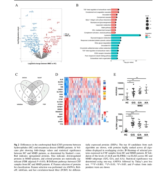 소아 모야모야병 조기 진단 가능성을 높이는 새로운 바이오마커가 발견됐다. 모야모야병 환자의 뇌척수액에서 ‘SLITRK1’ 단백질 발현이 유의미하게 높은 것으로 나타났다. 또한 뇌경색, 수술 예후 등 모야모야병의 임상 특성과 연관된 단백질도 확인돼, 난치성 질환인 모야모야병 치료에 새로운 패러다임을 제시할 것으로 기대된다.