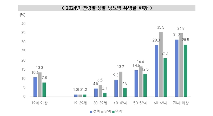 질병관리청 「2024 국민건강영양조사」에 따르면, 우리나라 당뇨병 유병률은 2023년보다 남녀 모두 증가하여 남자 13.3%(↑1.3%p), 여자 7.8%(↑0.9%p)로 나타났다. 연령별로 비교시 남자의 경우 60대(35.5%), 여자는 70대 이상(28.5%)에서 가장 높은 유병률을 보였다.