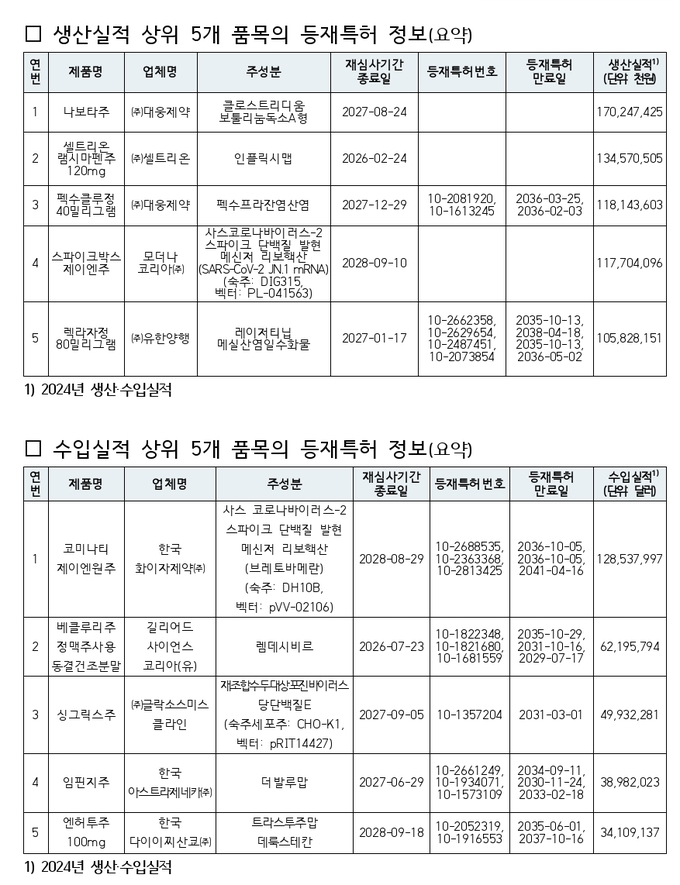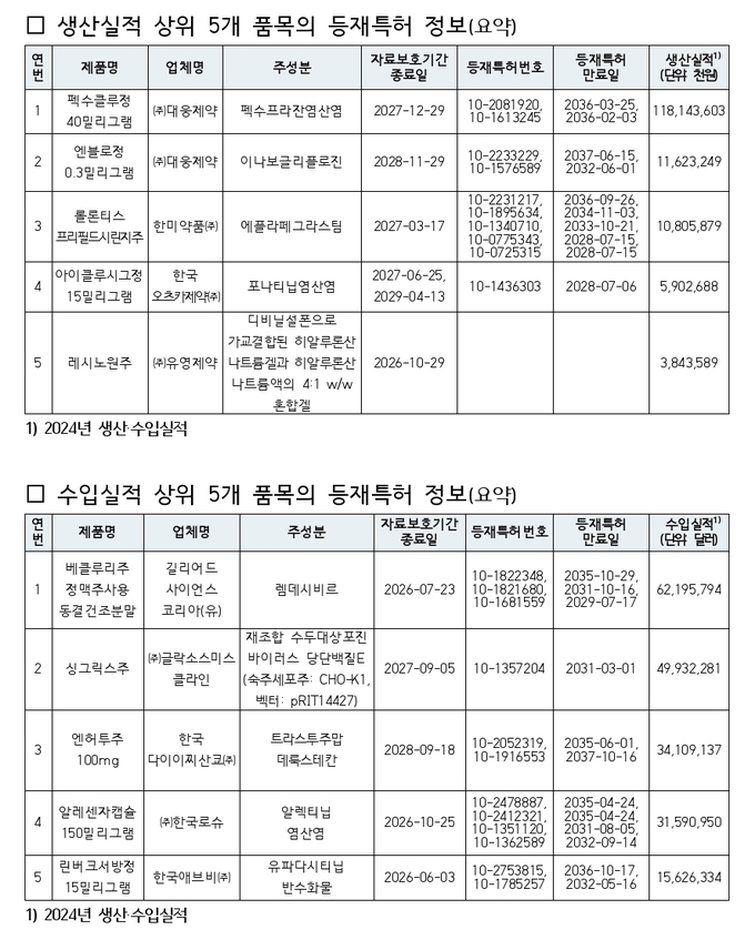 특히 펙수프라잔 제제, 보툴리눔 제제 등 생산·수입실적 상위 각 5개 품목에 대해서는 등재특허 정보 외에 해당 성분 관련 미등재된 특허정보를 추가로 제공한다.