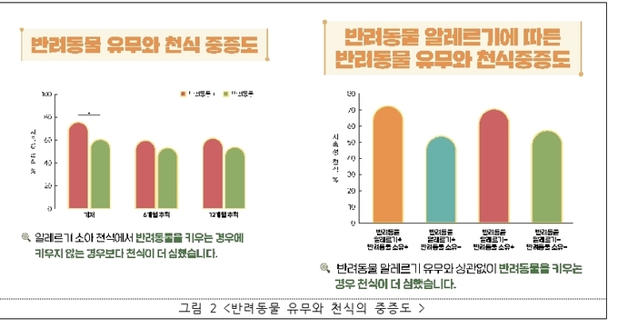 알레르기 소아천식 환자 중에서 반려동물을 키우는 경우 키우지 않는 경우보다 천식이 더 심했을 뿐 아니라, 반려동물 알레르기 유무와 상관없이 반려동물을 키우는 경우 천식이 더 심해지는 경향을 보였다.