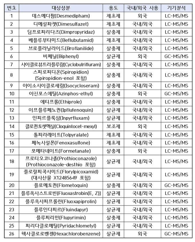 이와 함께 기후 온난화로 재배가 늘고 있는 망고, 바나나, 키위, 오크라, 용과, 패션프루트 등 아열대 작물 6품목에 대해 농약 22종의 잔류허용기준을 신설한다. 수입 농산물에 사용되는 농약 7종의 기준도 새로 마련하거나 개정하고, 쌀에 사용되는 농약 3종은 국제식품규격위원회(CODEX) 기준을 참고해 조정한다. 이 밖에도 디메설파젯 등 총 125종 농약의 잔류허용기준을 신설·개정하고, 동시 다성분 시험 대상 농약을 26종 추가해 총 540종 농약의 동시 분석이 가능하도록 했다. 식약처는 시행에 앞서 시험·검사기관 실무자 교육과 표준품 제공 등 현장 지원도 병행할 계획이다.