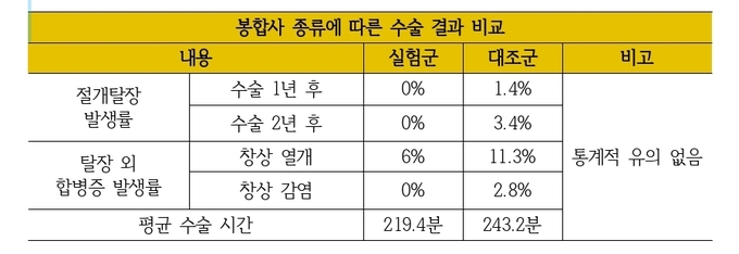 연구 결과, 바브드 봉합사는 기존 봉합사와 비교해 충분히 임상 적용이 가능한 것으로 나타났다. 실험군의 수술 후 1년, 2년 절개탈장 발생률은 모두 0%였으며, 대조군은 1년 1.4%, 2년 3.4%로 확인됐다.