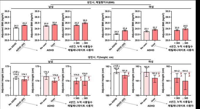 소아기에 주의력결핍 과잉행동장애(ADHD)를 진단받은 경우, 성인이 된 이후 체질량지수(BMI)가 더 높아질 가능성이 크며, 특히 메틸페니데이트를 1년 이상 사용한 집단에서 이러한 경향이 더욱 뚜렷하게 나타난다는 국내 대규모 인구 기반 연구 결과가 나왔다. 키의 경우 치료군에서 평균 신장이 소폭 낮았으나, 임상적으로 의미 있는 차이는 크지 않았다.