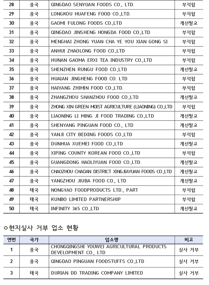 아울러 현지실사를 거부한 해외제조업소 3개소에 대해서도 수입중단 조치가 내려졌으며, 현재 해당 업소에서 제조한 식품은 국내로 수입되지 않고 있다.