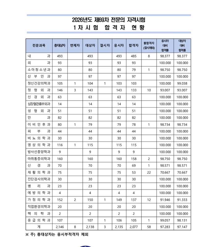 대한의학회가 오늘(6일) 지난 2월 3일에 시행된 2026년도 제69차 전문의 자격시험 1차시험의합격자(상세 내용 위 표 참조)를 발표했다.
